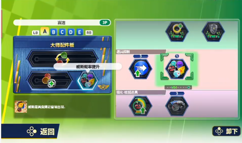 不过,也有不少选手选择了另辟蹊径——例如拿下本次比赛冠军的选手“热狗酱”,就搭配了一套主打道具管理的配装。他用三格配件板槽位锁定了“道具位置互换”,让自己能主动将前后排位置对换,而不至于出现某个关键道具被“卡手”的情况,也能确保自己将拿下胜局的关键道具留到最后使用。而在剩余的槽位上,他还选择了“道具栏扩容”和“威斯概率提升”,来同时保证自身的道具保有量和质量。